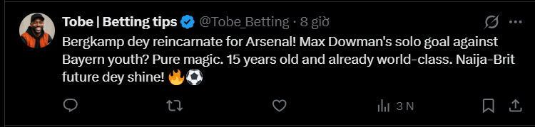 Lò đào tạo Arsenal tiếp tục trình làng một viên ngọc quý khi Max Dowman, tài năng chỉ mới 15 tuổi, ghi dấu ấn rực rỡ với cú đúp, trong đó có một siêu phẩm solo kinh ngạc giúp đội trẻ Arsenal đánh bại U19 Bayern Munich 4-2 tại UEFA Youth League. Màn trình diễn gây phấn khích đến mức một bộ phận người hâm mộ đã ví von rằng “Messi 15 tuổi cũng không làm được như vậy”.