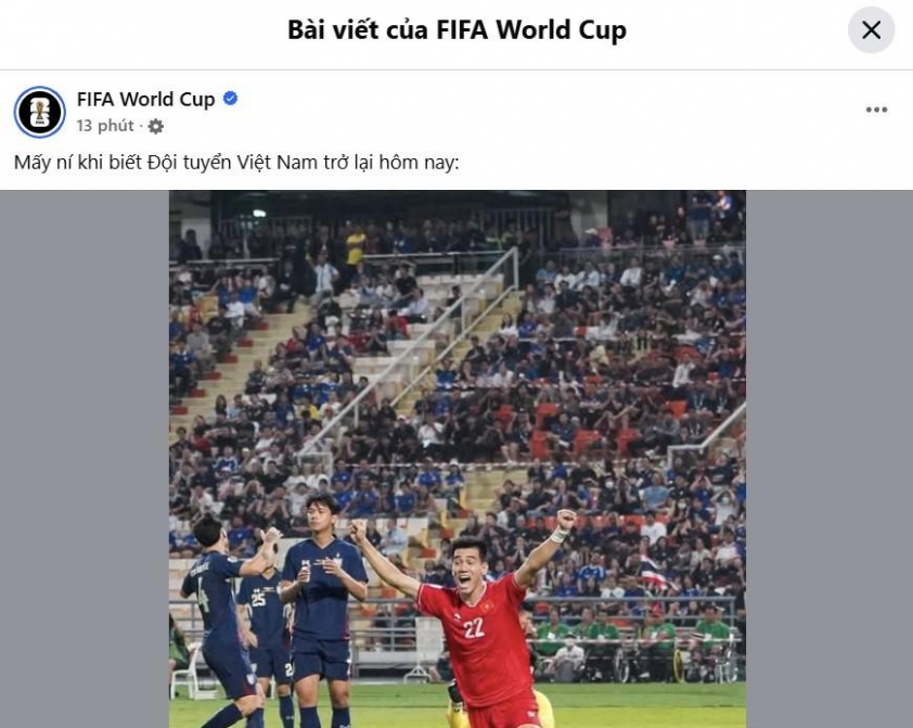 Chỉ ít giờ trước khi đội tuyển Việt Nam bước vào trận đấu gặp Nepal tại vòng loại Asian Cup 2027, trang Facebook chính thức của FIFA đã bất ngờ đăng tải bài viết liên quan đến "Chiến binh Sao Vàng", thu hút sự chú ý đặc biệt từ người hâm mộ trong nước.