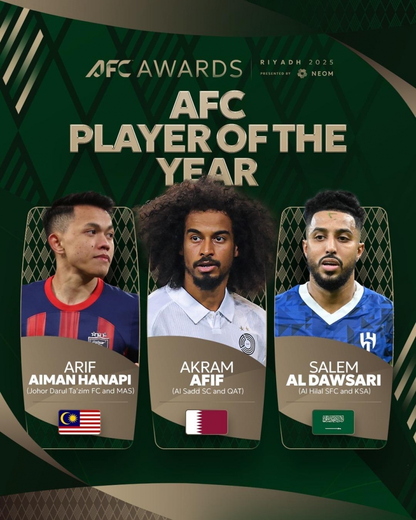 Ba cái tên Arif Aiman, Akram Afif và Salem Al-Dawsari được xem là đại diện tiêu biểu cho ba nền bóng đá đang lên của châu lục. Ai trong số họ sẽ được xướng tên là Cầu thủ xuất sắc nhất châu Á 2025? Câu trả lời sẽ được tiết lộ trong đêm gala đáng chờ đợi tại Riyadh.