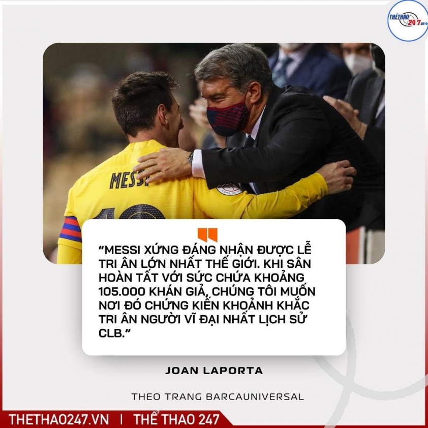 Barca chuẩn bị lễ tri ân “vĩ đại nhất lịch sử”. Tuy nhiên, Laporta khẳng định rằng Barcelona đang lên kế hoạch tổ chức một buổi tri ân hoành tráng dành cho Messi sau khi công trình cải tạo sân Spotify Camp Nou hoàn tất.