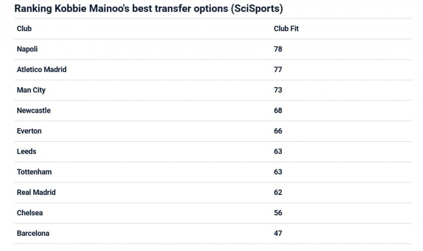Các phân tích từ công ty dữ liệu SciSports cho thấy Napoli là điểm đến lý tưởng nhất cho Mainoo, với “độ phù hợp” đạt 78 điểm cao nhất trong số các CLB theo đuổi. Atletico Madrid (77 điểm) và Man City (73 điểm) xếp ngay sau đó.