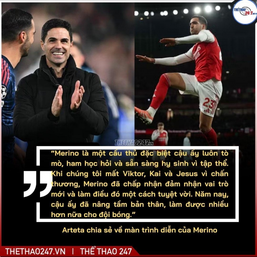 Phát biểu sau trận, HLV Mikel Arteta không giấu nổi sự tự hào về cậu học trò đồng hương: “Merino là một cầu thủ đặc biệt cậu ấy luôn tò mò, ham học hỏi và sẵn sàng hy sinh vì tập thể. Khi chúng tôi mất Viktor, Kai và Jesus vì chấn thương, Merino đã chấp nhận đảm nhận vai trò mới và làm điều đó một cách tuyệt vời. Năm nay, cậu ấy đã nâng tầm bản thân, làm được nhiều hơn nữa cho đội bóng.”