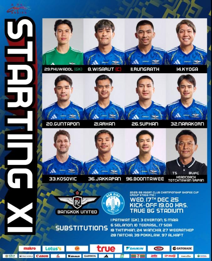 - Bangkok United: Khammai, Selanon, Manuel Bihr, Everton, Notechaiya, Thitiphan Puangchan, Zakaria Jradi, Anan, Mahmoud Eid, Luka Adzic, Al Ghassani