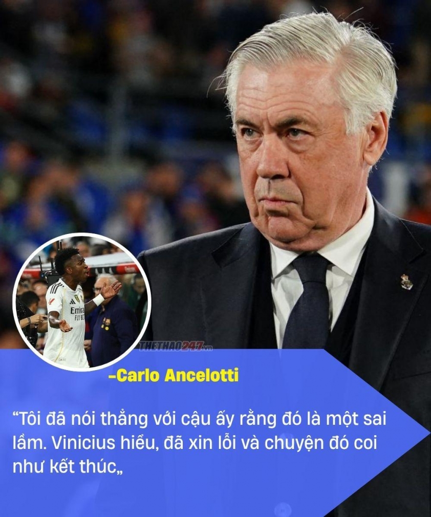 Ancelotti nói: “Chúng tôi có mối quan hệ rất tốt với Vinicius. Khi có chuyện xảy ra, tôi luôn chọn cách đối thoại. Tôi đã nói thẳng với cậu ấy rằng đó là một sai lầm. Vinicius hiểu, đã xin lỗi và chuyện đó coi như kết thúc. Cậu ấy là cầu thủ quan trọng của chúng tôi.”