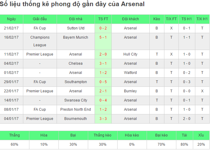 - Arsenal thua 3, thắng 2 trong 5 trận gần nhất trên mọi đấu trường.