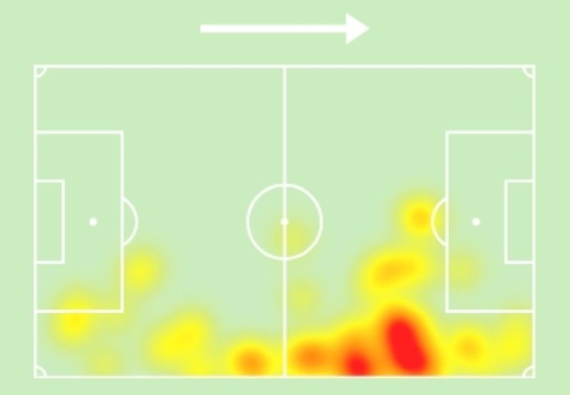 Được giao nhiệm vụ hậu vệ cánh phải, Conor Bradley hoạt động rất năng nổ, đặc biệt trong khâu tham gia tấn công. Bản đồ nhiệt cho thấy Bradley chủ yếu hoạt động bên phần sân của Chelsea, anh cũng tham gia gây áp lực cho đối thủ với những tình huống bó vào trung lộ trước khu vực cấm địa của The Blues.