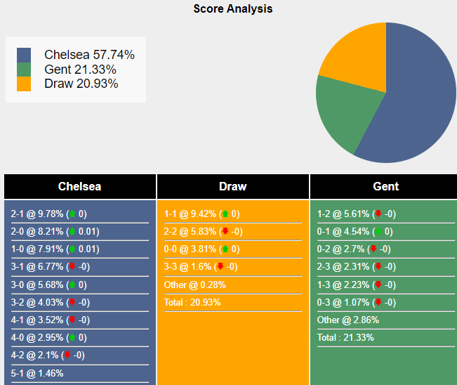 Tỷ số khả dĩ nhất cho chiến thắng của Chelsea là 2-1 với xác suất là 9,78%. Tỷ số khả dĩ thứ hai cho kết quả đó là 2-0 (8,21%) và 1-0 (7,91%). Chiến thắng khả dĩ nhất của Gent là 1-2 (5,61%), trong khi tỷ số hòa là 1-1 (9,42%).