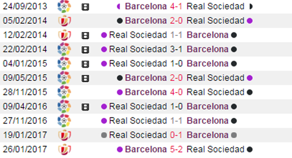 Tỷ lệ chiến thắng khi đối đầu của Barcelona là 50%, và của Real Sociedad là 30% và tỷ lệ hòa giữa hai đội là 20%.