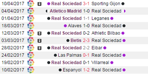 Và trong 10 trận đấu đó, đội khách Real Sociedad có 5 lần Thắng kèo (50%), 0 lần Hòa kèo (0%) và 5 lần Thua kèo (50%).