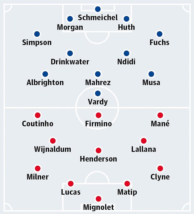 Leicester City: Schmeichel, Simpson, Morgan, Huth, Fuchs, Drinkwater, Ndidi, Mahrez, Okazaki, Albrighton, Vardy.