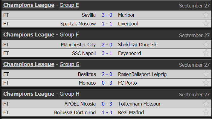 Một đội bóng Anh khác cũng thi đấu là Liverpool chỉ có một diểm trên đất Nga khi hòa 1-1 trước Spartak Moscow. Trong khi đó Sevilla thắng 3-0 Maribor.