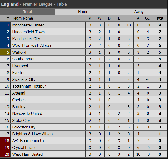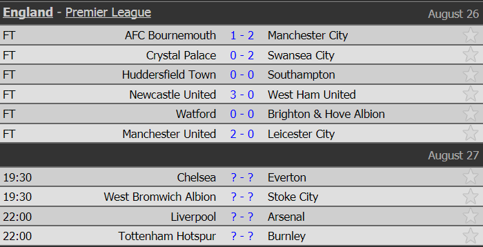 Trên sân Bournemouth, Man City cần đến phút 90+7 mới có bàn thắng ấn định thắng lợi 2-1 của Sterling. Chiến thắng nhọc nhằn này giúp họ có 7 điểm sau ba trận. Ít giờ sau, Man Utd được chơi trên sân nhà tiếp Leicester City. Họ cần 70 phút để khai thông bế tắc do công của Rashford. Phút 82, tỉ số là 2-0 sau pha lập công của Fellaini. Thắng 2-0, MU tiếp tục ngự trị đỉnh BXH Premier League.