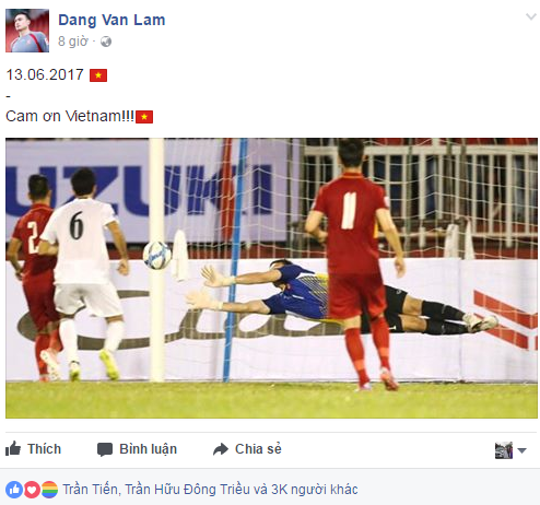 Trên trang facebook cá nhân của mình, thủ môn đang thi đấu cho CLB Hải Phòng tại V-League 2017 cũng gửi lời cảm ơn tới BHL đội tuyển cũng như sự cổ vũ nồng nhiệt của các CĐV bóng đá Việt Nam. Và nhanh chóng sau đó, điều này cũng đã nhận được rất nhiều những lời chúc từ bạn bè và người hâm mộ.