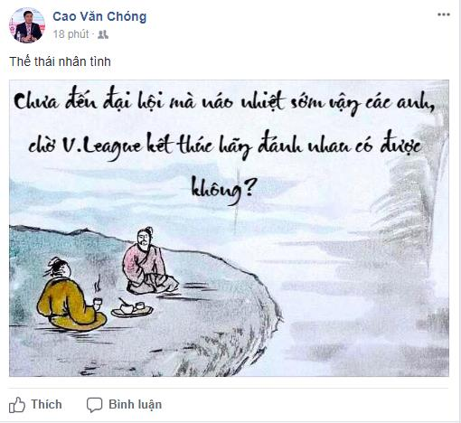 Trên trang cá nhân, TGĐ VPF Cao Văn Chóng lên tiếng cảm thán: “Chưa đến đại hội mà náo nhiệt sớm vậy các anh, chờ V-League kết thúc hãy đánh nhau có được không?”. Mặc dù ông chỉ để chế độ status là bạn bè, nhưng cánh báo giới sớm phát giác lời tâm sự của vik TGĐ này.