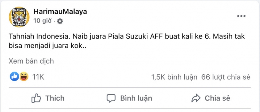Ngay sau thất bại đậm của thầy trò HLV Shin Tae-yong trước Những chú Voi chiến, trang fanpage gần 2 triệu lượt thích của Malaysia - HarimauMalaya đăng tải: "Chúc mừng Indonesia. Á quân AFF Cup lần thứ 6. Vẫn không thể trở thành nhà vô địch".