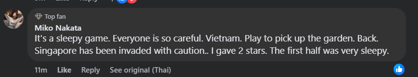 "Singapore lần đầu tiên vào bán kết, cố gắng mọi cách để giành chiến thắng. Quốc gia giàu nhất Đông Nam Á chơi bóng trên sân nhân tạo (haha). Thật đáng tiếc".