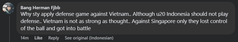 "Tại sao Shin Tae Yong lại áp dụng lối chơi phòng ngự trước Việt Nam.. U20 Indonesia không nên chơi phòng ngự. Việt Nam không mạnh như người ta nghĩ.. Trước Singapore họ mất quyền kiểm soát bóng hoàn toàn", một CĐV Indonesia bình luận.