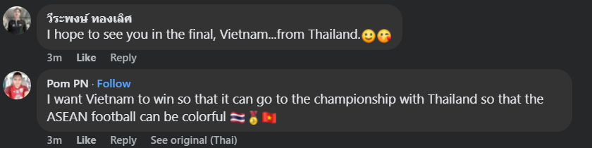 Trong khi đó, nhiều CĐV Thái Lan đều hi vọng ĐT Việt Nam sẽ vượt qua bán kết trước Singapore.