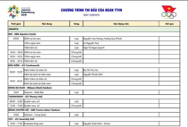 9h sáng ngày 19/8, nội dung thi đấu chung kết đầu tiên của ASIAD 2018 đã diễn ra. Đó là nội dung biểu diễn trường quyền Nam của môn wushu. Việt Nam có một đại diện có tiềm năng giành huy chương là Trần Xuân Hiệp, người đã từng đứng thứ 4 tại ASIAD 2014 và hi vọng có huy chương tại kỳ đại hội năm nay.
