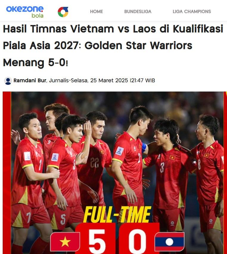 Trong đó, tờ Bola Okezone cho rằng: "ĐT Việt Nam quyết tâm giành vé dự Asian Cup 2027. Chiến thắng này là tài sản quan trọng cho nhà vô địch AFF Cup 2024 trong nỗ lực giành vé tham dự Asian Cup 2027".