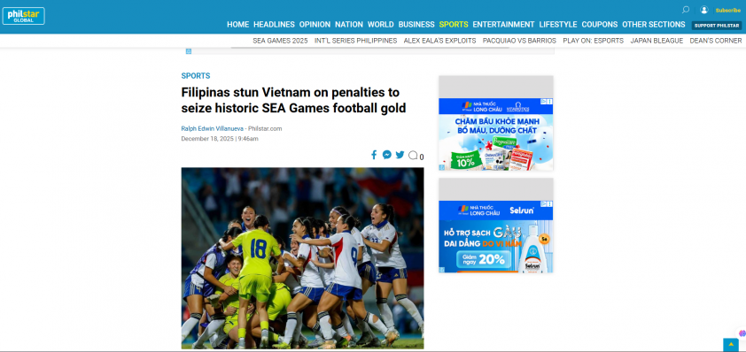 Trong bài viết đăng tải sáng 18/12, Philstar nhấn mạnh rằng đội tuyển nữ Philippines đã “gây sốc” khi quật ngã Việt Nam, thế lực hàng đầu của bóng đá nữ khu vực, để lần đầu tiên trong lịch sử giành Huy chương Vàng SEA Games. Theo tờ báo Philippines, hai đội đã giằng co quyết liệt suốt 90 phút thi đấu chính thức mà không thể ghi bàn. Việt Nam được đánh giá là đội kiểm soát thế trận tốt hơn trong nhiều thời điểm, song Filipinas cho thấy sự lì lợm và kỷ luật trong lối chơi, đặc biệt là khả năng phòng ngự chắc chắn trước sức ép liên tục từ đối thủ.