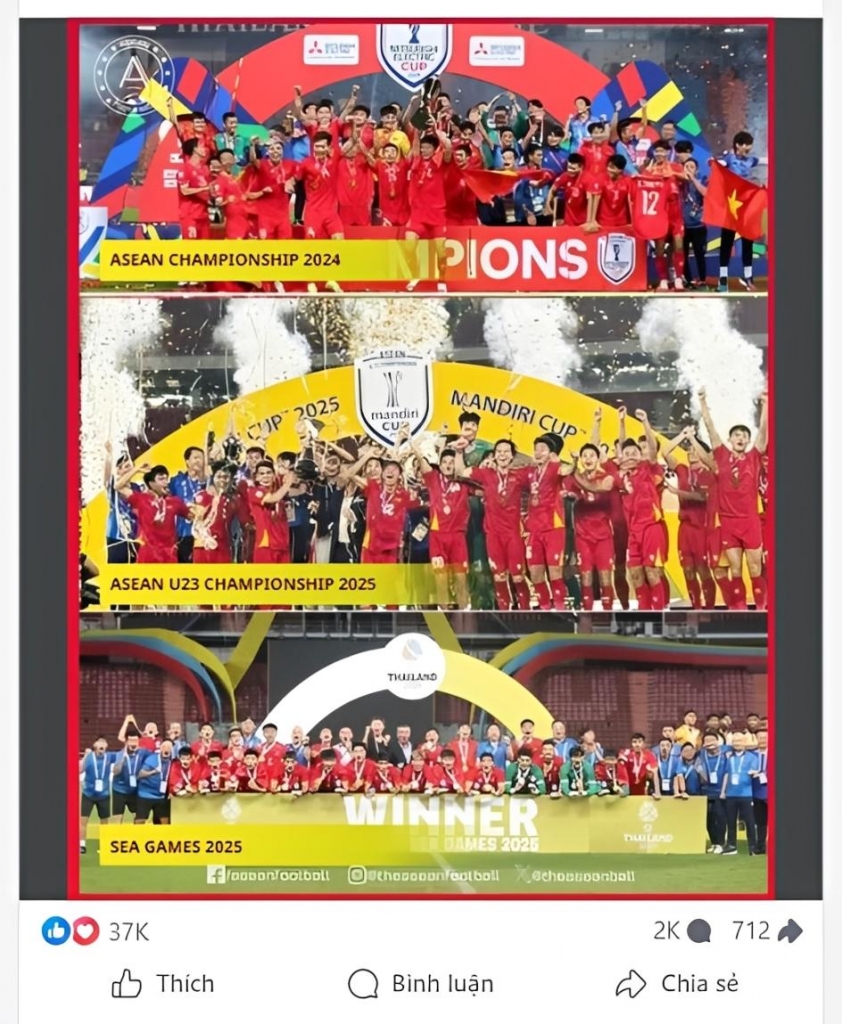 Khép lại SEA Games 33 bằng chiến thắng nghẹt thở trước Thái Lan, bóng đá nam Việt Nam chính thức hoàn tất cú hat-trick danh hiệu chỉ trong một năm dương lịch. Trước đó, bóng đá Việt Nam đã đăng quang ASEAN Cup 2024 vào tháng 1 và tiếp tục thống trị giải U23 Đông Nam Á 2025 trong tháng 7, tạo nên chuỗi thành tích khiến cả khu vực nể phục.
