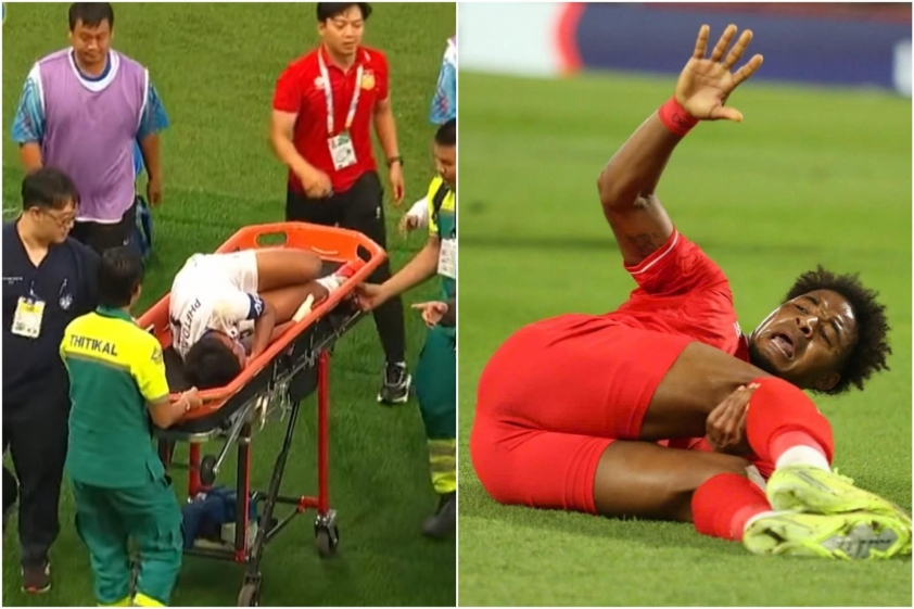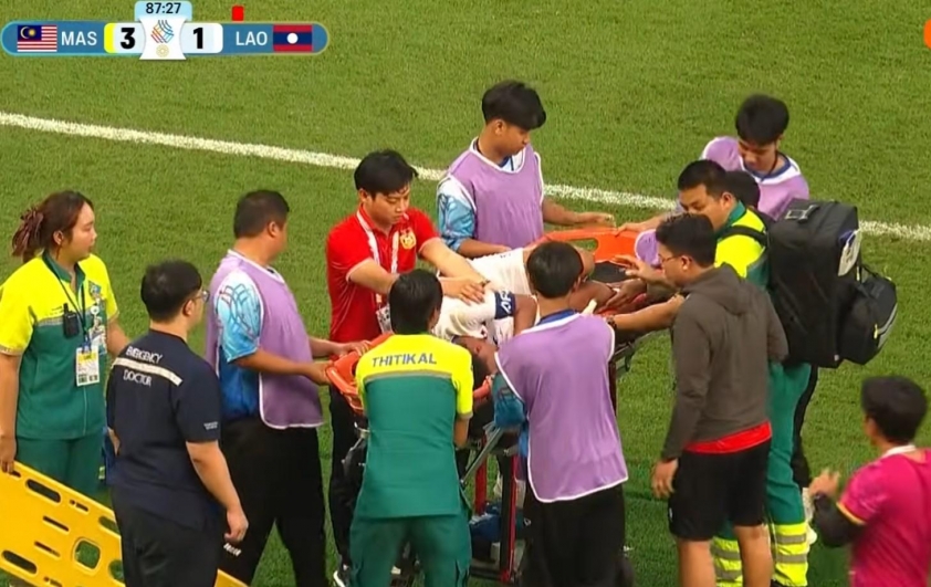 Phetdavanh Somsanid của U22 Lào bị gãy chân trong tình huống cố tình va chạm với 1 cầu thủ Malaysia.