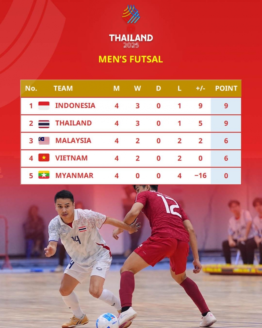 Chiều 19/12, đội tuyển futsal Việt Nam đã khép lại hành trình tại SEA Games 33 bằng chiến thắng 4-2 trước Myanmar trong trận đấu cuối cùng của môn futsal nam. Với kết quả này, cơ hội cạnh tranh HCĐ đối với thầy trò HLV Diego Giustozzi là rất thấp do bất lợi về hiệu số bàn thắng bại so với Indonesia, đối thủ sẽ đá trận cuối gặp Thái Lan vào 19h cùng ngày.