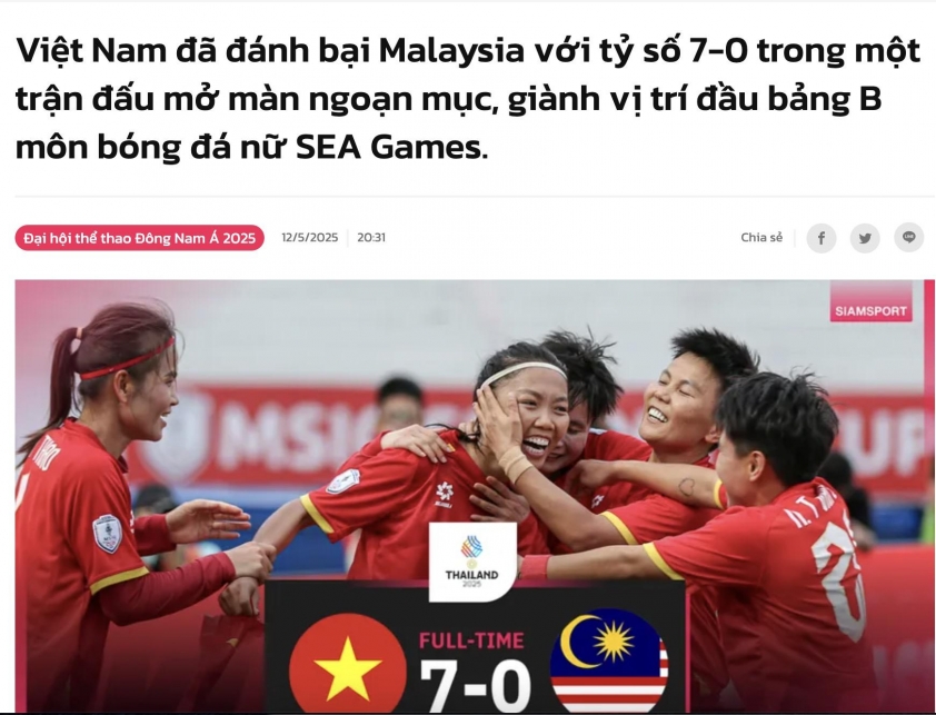 Trong khi đó, tờ SiamSport của Thái Lan lại miêu tả: "Việt Nam đã đánh bại Malaysia với tỷ số 7-0 trong một trận đấu ra quân cực kỳ ngoạn mục, giành vị trí đầu bảng B môn bóng đá nữ SEA Games. Đương kim vô địch của giải đấu đã thị uy sức mạnh bằng những bàn thắng liên tiếp".