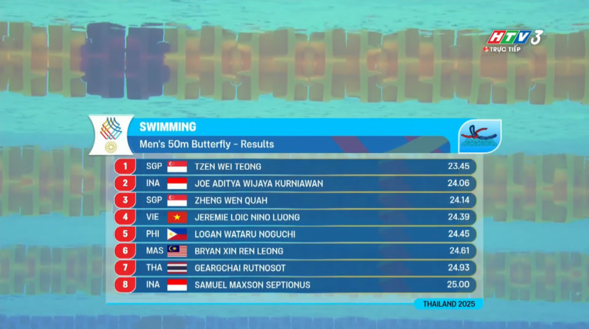 Ở nội dung 50m bướm nam, Việt Nam có Jeremie Loic Nino Luong thi đấu. Anh đã không phụ lòng người hâm mộ khi hoàn thành phần thi với thời gian 24 giây 39, xếp thứ 4 ở vòng loại và giànhn quyền vào chung kết.