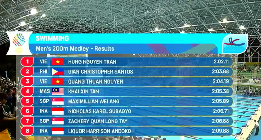 Trần Hưng Nguyên đã xuất sắc mang về tấm Huy chương Vàng đầu tiên cho bơi lội Việt Nam ở chung kết 200m hỗn hợp nam SEA Games 33. Kình ngư sinh năm 2003 vượt trội so với các đối thủ ngay ở những mét đầu tiên, sau đó về đích với thời gian 2 phút 02 giây 11.
