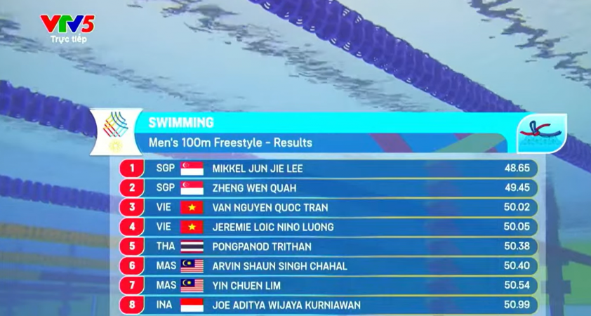 Ở nội dung 100m tự do nam, Trần Văn Nguyễn Quốc không thể cạnh tranh với hai vận động viên của Singpore, qua đó chấp nhận về thứ 3 chung cuộc với thành tích 50 giây 02. Xếp ngay sau anh là người đồng đội Lương Jeremie Loic Nino với thời gian 50 giây 05.