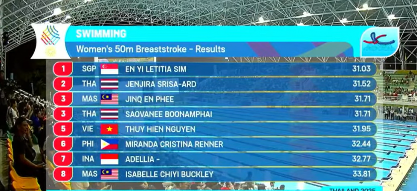 Ở nội dung chung kết 50m ếch nữ, Nguyễn Thúy Hiền không thể tạo nên bất ngờ khi chỉ về đích thứ 5 với thời gian 31 giây 95. Trong khi đó, Sim En Yi Letitia của đoàn Singapore đã có tấm HCV thứ 2 tại SEA Games 33 lần này.