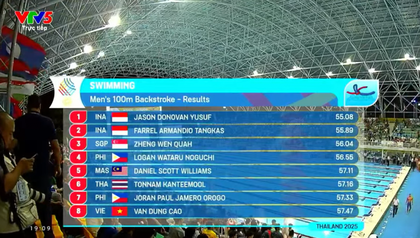 Tại chung kết 100m bơi ngửa nam, Cao Văn Dũng ở làn bơi số 8 dù có xuất phát khá tốt nhưng đã bị các đối thủ khác bỏ lại phía trong khoảng 50m đầu tiên. Chung cuộc, đại diện của Việt Nam về đích cuối cùng với thời gian 57 giây 47. Người về nhất ở nội dung này là vận động viên 18 tuổi Jason Donovan. Đây cũng là tấm Huy chương vàng đầu tiên của Indonesia ở bộ môn Bơi lội.