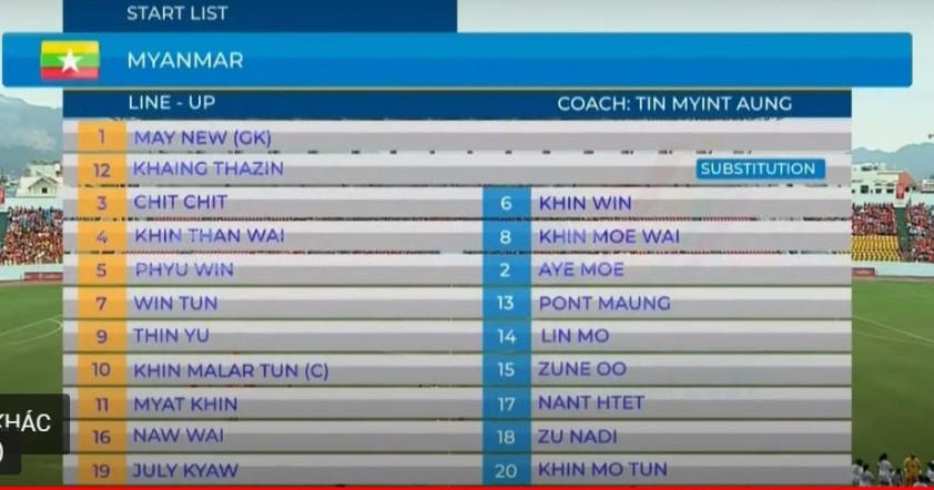 Hai đội chơi ăn miếng trả miếng ngay những phút đầu hiệp 1. Myanmar là đội có bàn mở tỷ số ở phút thứ 24. Trên chấm 11m, Win Theigi Tun không mắc bất cứ sai lầm nào giúp ĐT nữ Myanmar khai thông thế bế tắc. Tuy nhiên, sau đó, Win Theigi Tun đã phải rời sân do chấn thương khiến sức mạnh của đội bóng áo đỏ bị giảm đi đáng kể.