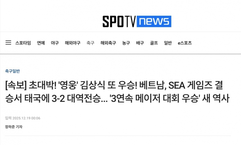 Chiến thắng này không chỉ mang về tấm HCV SEA Games 33 mà còn đưa tên tuổi HLV Kim Sang Sik lên một tầm cao mới. Tờ Sport News của Hàn Quốc đã bày tỏ sự sửng sốt với dòng tít lớn: “Thành công vang dội! ‘Người hùng’ Kim Sang-sik lại giành chiến thắng! Việt Nam đánh bại Thái Lan 3-2 trong trận chung kết SEA Games… Một kỷ nguyên mới với ba chức vô địch lớn liên tiếp.”