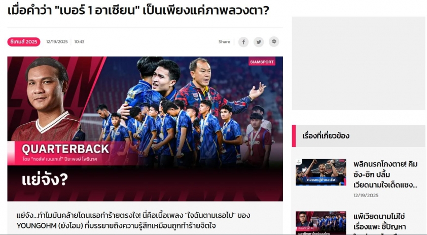 Siam Sport mở đầu bài viết bằng cảm xúc u ám, ví nỗi đau của người hâm mộ Thái Lan như “bị đâm thẳng vào tim”, mượn tinh thần ca khúc “ใจฉันตามเธอไป” của YOUNGOHM để diễn tả trạng thái suy sụp sau khi đội nhà thêm một lần gục ngã trước Việt Nam. Theo tờ báo này, ký ức thua Việt Nam ở chung kết ASEAN Cup 2025 ngay trên sân nhà Rajamangala vẫn chưa kịp nguôi ngoai, thì “bộ phim cũ” ấy lại tiếp tục lặp lại, thậm chí còn đau đớn hơn.