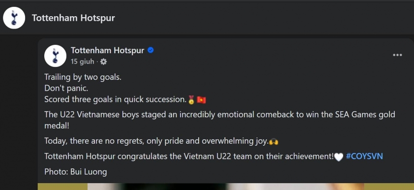 Thông điệp của CLB nước Anh viết đầy cảm xúc: “Bị dẫn 2 bàn. Không hoảng loạn. Ghi liền 3 bàn. Các chàng trai U22 Việt Nam đã tạo nên màn lội ngược dòng quá cảm xúc để giành tấm HCV SEA Games! Hôm nay không còn tiếc nuối, chỉ còn tự hào và vỡ oà. Tottenham Hotspur xin chúc mừng thành tích của ĐT U22 Việt Nam!”