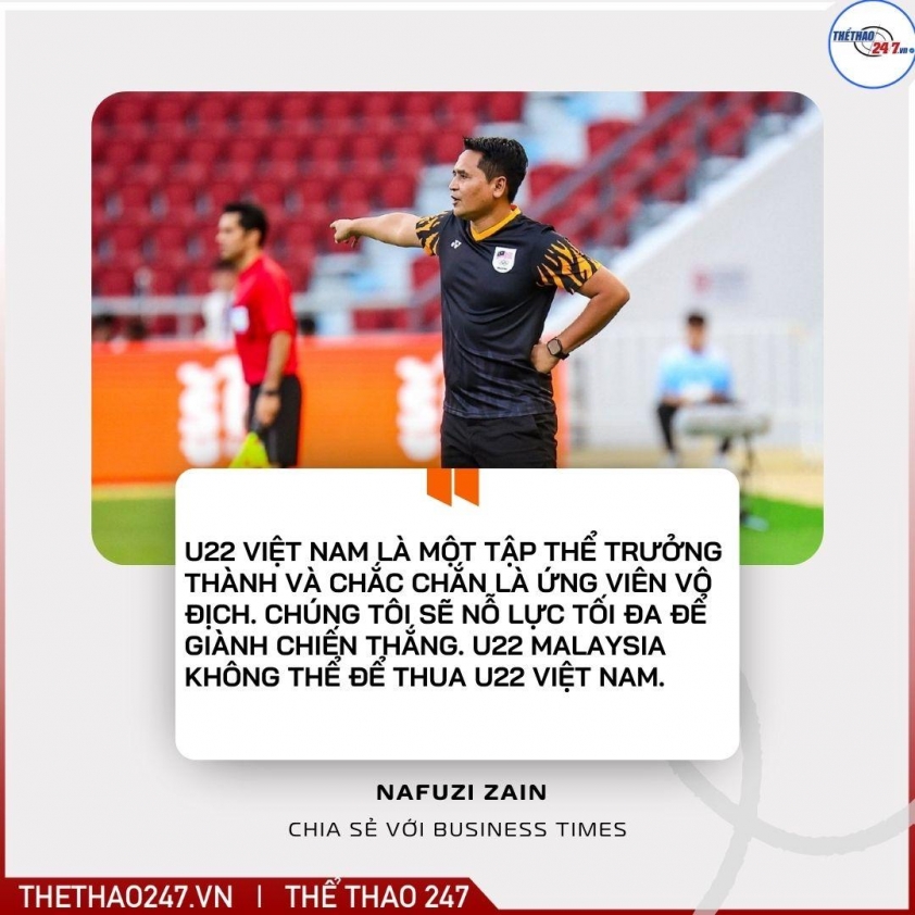 Tôi đã xem U22 Việt Nam thi đấu với U22 Lào. Họ rất mạnh, nhanh và giàu kỹ thuật. Đó là một tập thể trưởng thành và chắc chắn là ứng viên vô địch. Chúng tôi sẽ nỗ lực tối đa để giành chiến thắng.U22 Malaysia không thể để thua U22 Việt Nam, và chúng tôi phải chuẩn bị tốt hơn nữa cho trận đấu đó”, HLV Nafuzi Zain nhấn mạnh.