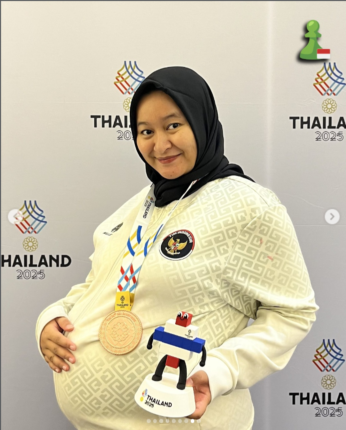 Dù đang ở giai đoạn cuối của thai kỳ, kỳ thủ Aulia Medina Warda vẫn thi đấu và góp công giúp đội tuyển cờ vua nữ Indonesia giành huy chương vàng cờ nhanh đồng đội tại SEA Games 33.