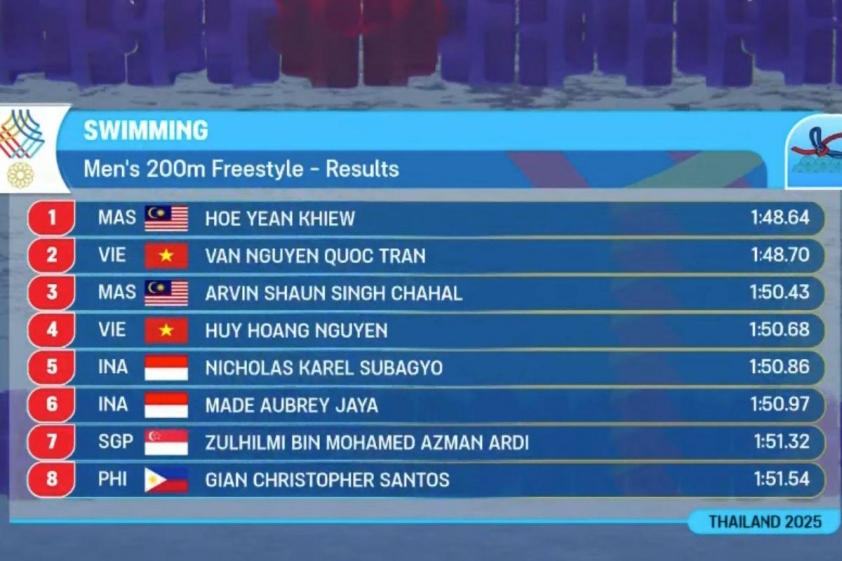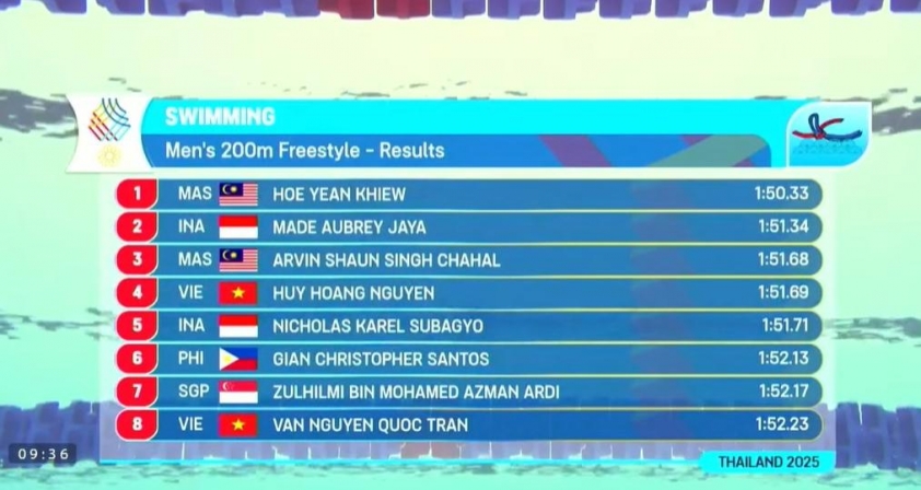 9h36: Bơi - Kết quả vòng loại 200m tự do Nam - Việt Nam vào chung kết