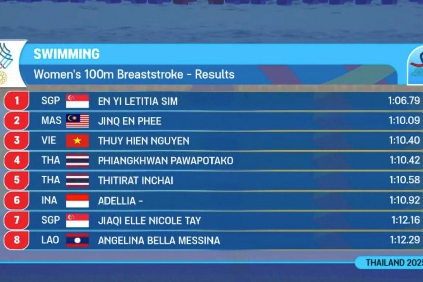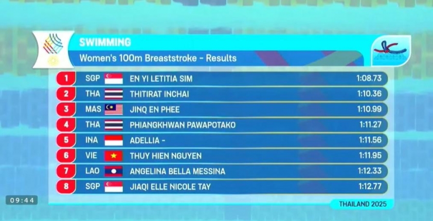 9h36: Bơi - Kết quả vòng loại 100m bơi ếch Nữ - Việt Nam vào chung kết