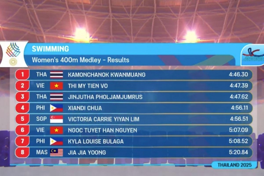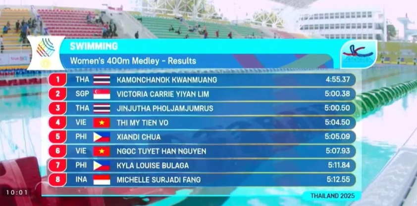 Võ Thị Mỹ Tiên cán đích ở vị trí thứ 2 nội dung 400m hỗn hợp nữ và giành HCB, về nhất là VĐV của Thái Lan với thành tích 4 phút 46 giây 30.
