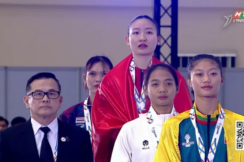 16h00: Một lần nữa quốc ca Việt Nam lại được vang lên, Đinh Thị Hương đứng trên bục cao nhất trong màn so tài Kumite -68 kg Nữ.