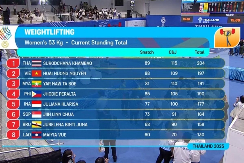 Nguyễn Hoài Hương đạt thành tích tổng cử 197kg, đứng thứ 2 sau VĐV cỷa Thái Lan. Qua đó mang về tấm HCB tiếp theo cho đoàn Thể thao Việt Nam.