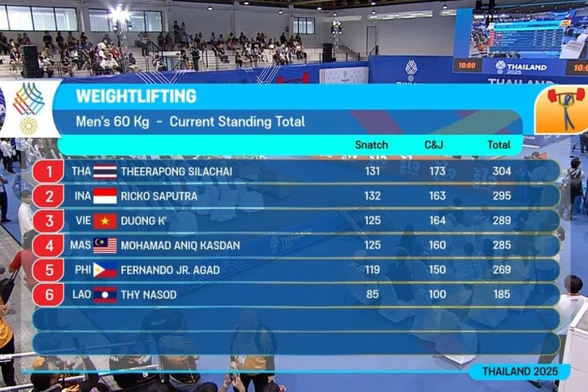 K' Dương đứng thứ 3 nội dung 60kg nam với tổng cử là 289, mang về HCĐ cho đoàn TTVN.