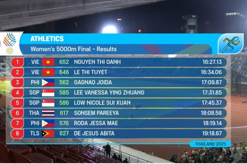 18h56: Tại chung kết 5.000m điền kinh nữ, 2 VĐV của chúng ta là Nguyễn Thị Oanh và Lê Thị Tuyết đang out trình các đối thủ khi vượt lên trước hơn 1 vòng.