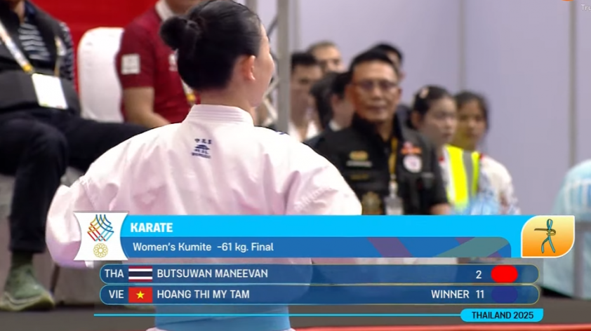 Ở nội dung Kumite -61kg nữ môn Karate, Hoàng Thị Mỹ Tâm vượt qua VĐV Thin Zar Yoon của Myanmar để vào chung kết.