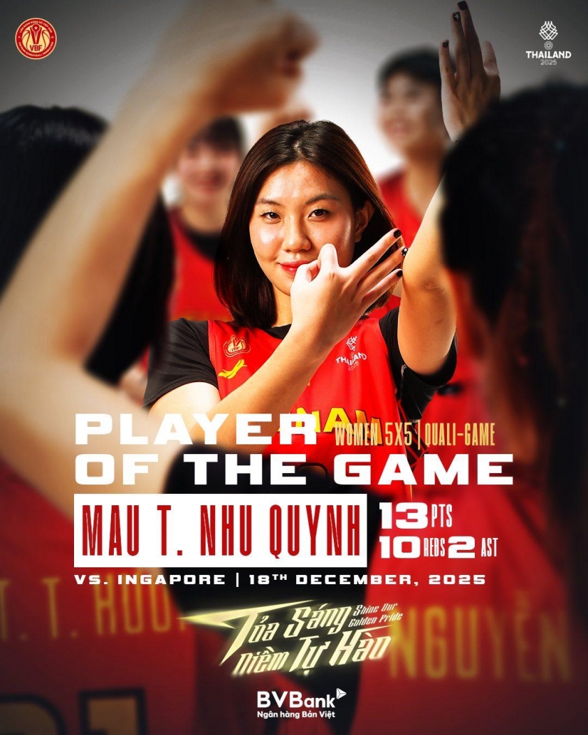 Màn "bật tôm" kì tích này giúp bóng rổ nữ Việt Nam có chiến thắng đầu tiên ở nội dung 5x5 SEA Games 33, đồng thời kết thúc Đại hội ở vị trí thứ 5 chung cuộc. Dù thất bại trong nhiệm vụ cạnh tranh huy chương, cô trò HLV Naeimeh Zafar vẫn kịp để lại màn trình diễn cực kì đáng nhớ.