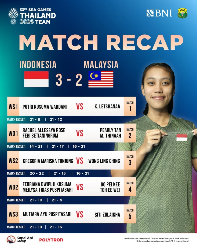 Indonesia và Malaysia chia điểm ở 2 trận đánh đôi, buộc cặp đấu này phải phân định thắng - bại ở trận đơn quyết định. Tại đây, Mutiara Ayu Puspitasari - tay vợt 19 tuổi của Indonesia xuất sắc hạ Siti Zulaikha 21-18; 21-16, mang về chiến thắng chung cuộc 3-2 cùng tấm vé vào chung kết cho cầu lông "Xứ vạn đảo".